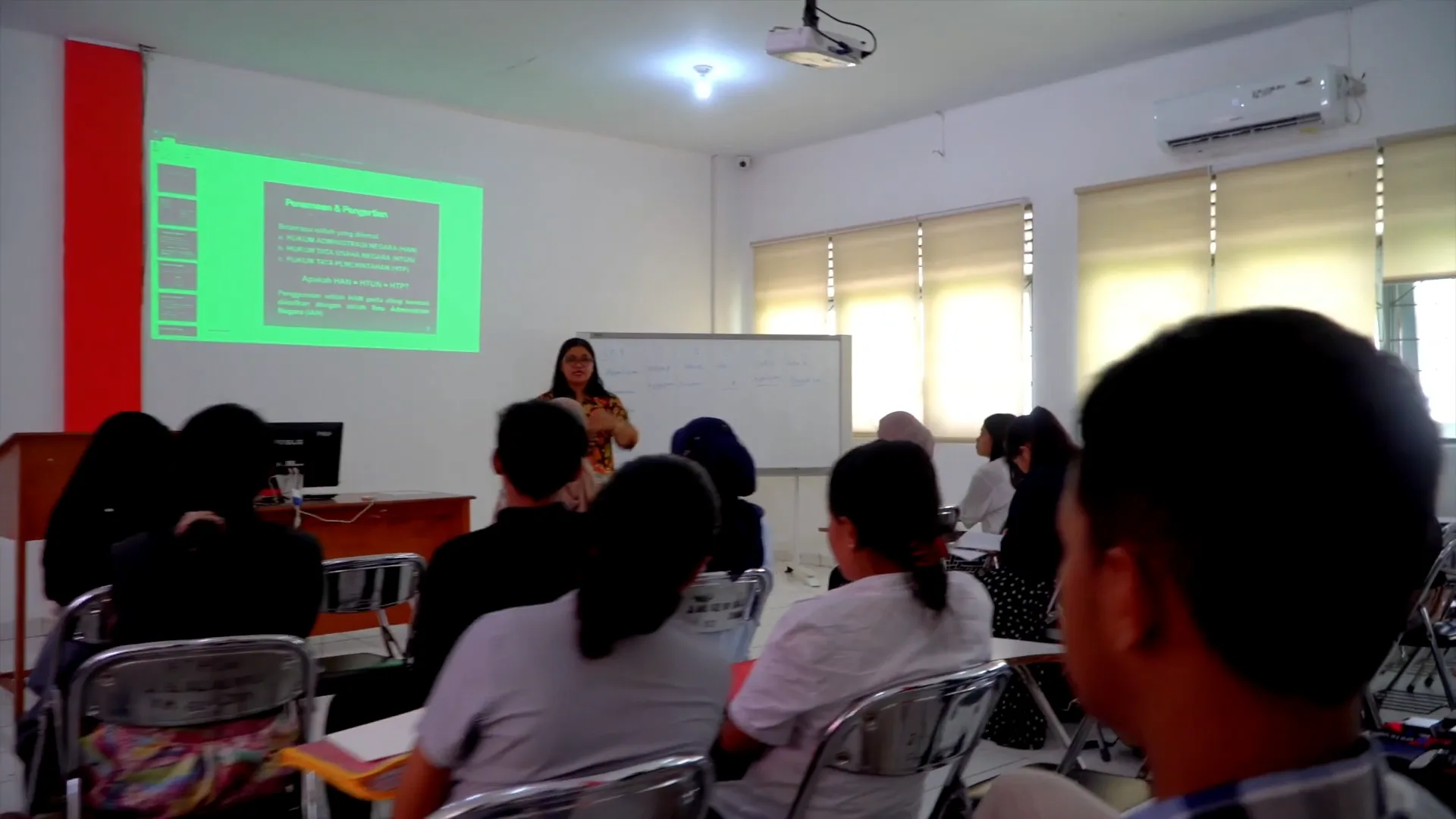 Setiap ruang kuliah telah dilengkapi dengan pendingin ruangan (AC), perangkat komputer (PC desktop), serta proyektor untuk mendukung proses pembelajaran berbasis teknologi dan presentasi interaktif.